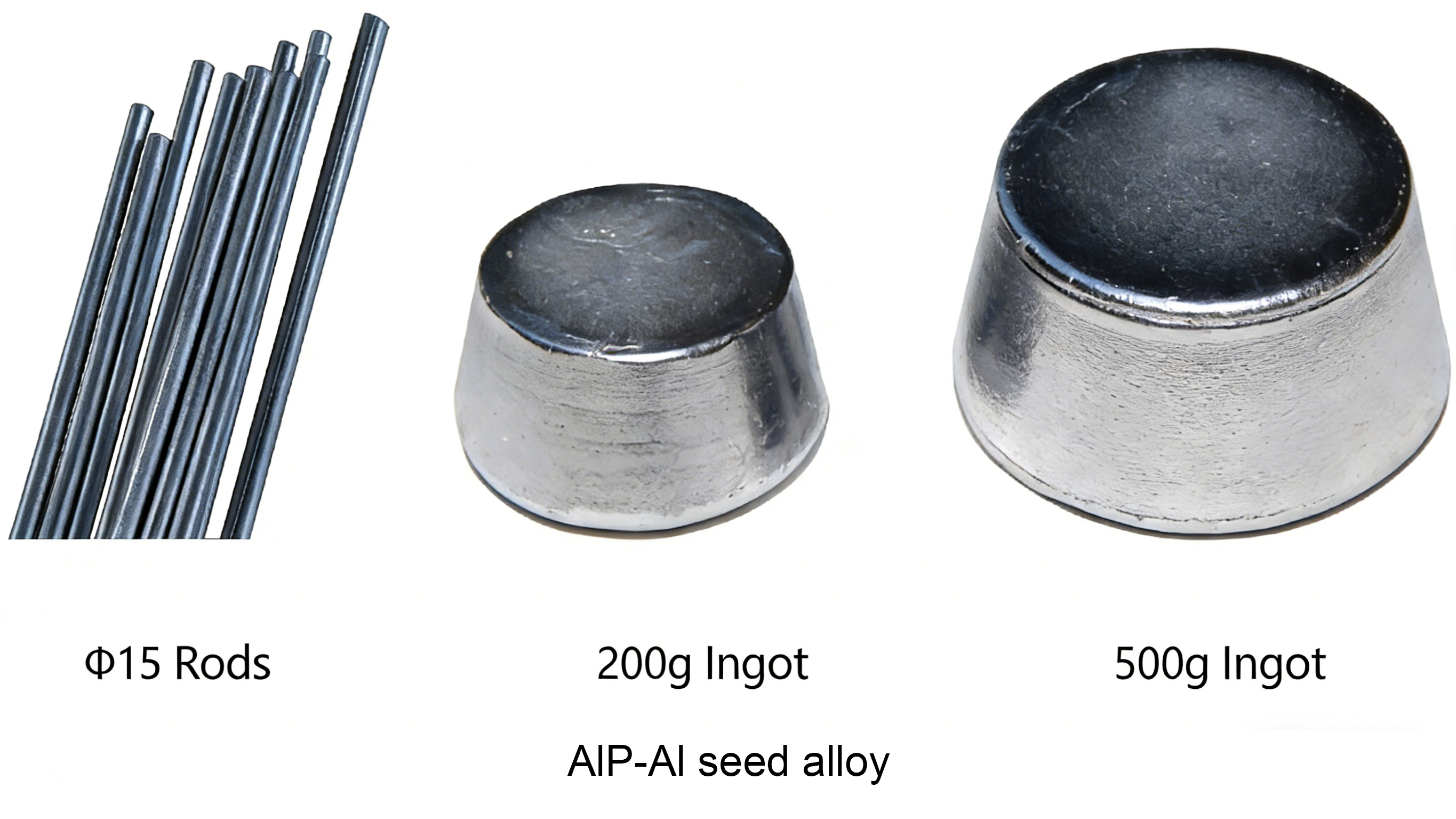 1. Microstructure refinement of near-eutectic and hypereutectic Al-Si alloy ingots (bars) (such as ZL109, A390, etc.) . 2. Quality treatment and solidification structure control of key engine components such as aluminum alloy pistons, cylinder blocks, and cylinder heads. 3. The initial crystalline Si micro-nanocrystallization in high-silicon aluminum alloy gravity, low-pressure and die-casting parts. | 1. The modifying effect is refined, stable, long-lasting and hereditary; 2. It enhances the volume stability, wear resistance, thermal fatigue resistance and service reliability of the aluminum parts. 3. It helps to achieve precise control of phosphorus content. 4. The processes of refinement, modification and alloying occur simultaneously. The addition operation is simple, environmentally friendly, energy-saving and cost-reducing. | Φ15 rod 200g ingot 500g ingot |