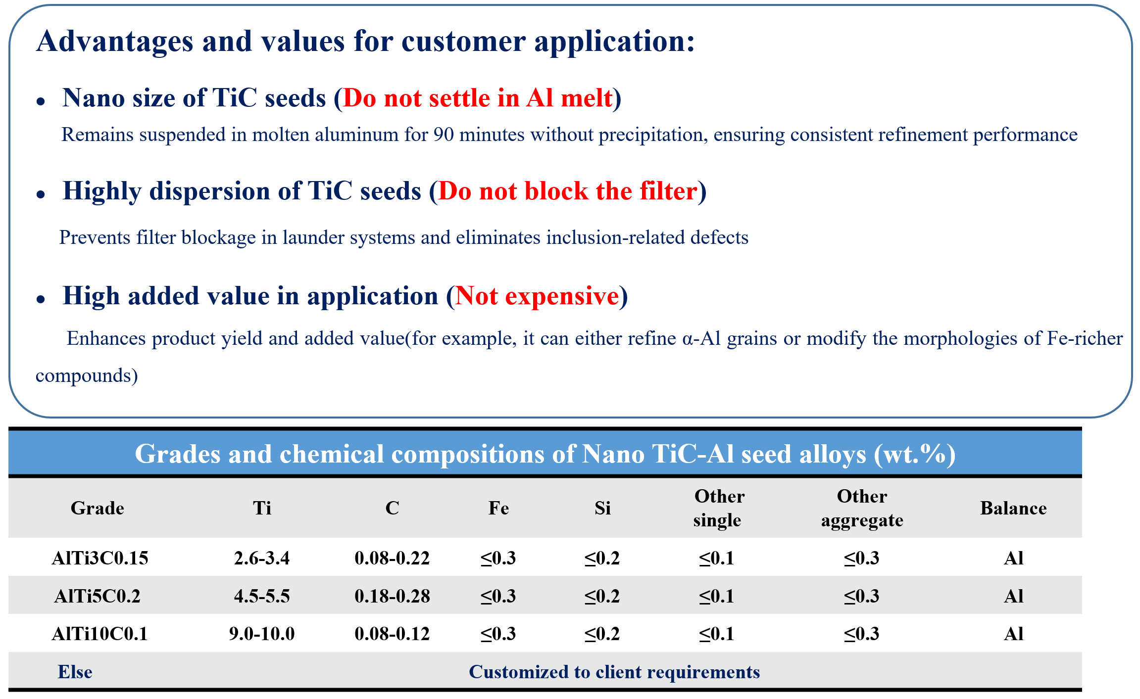 A series of nano TiC-Al master alloy materials have been invented and developed, which are suitable for grain refinement and Fe phase transformation treatment of deformation aluminum alloys. They are particularly applicable to the production and processing of aluminum plates, strips, foils and 3C products. While achieving grain refinement and improving the yield rate, they can also enhance the uniformity of the aluminum material's structure, corrosion resistance and strength and toughness.